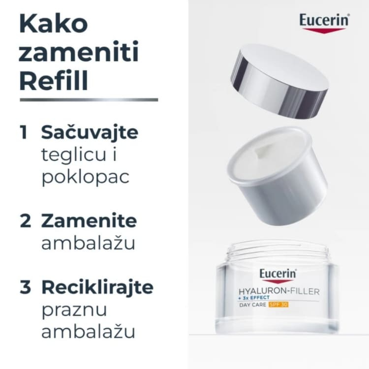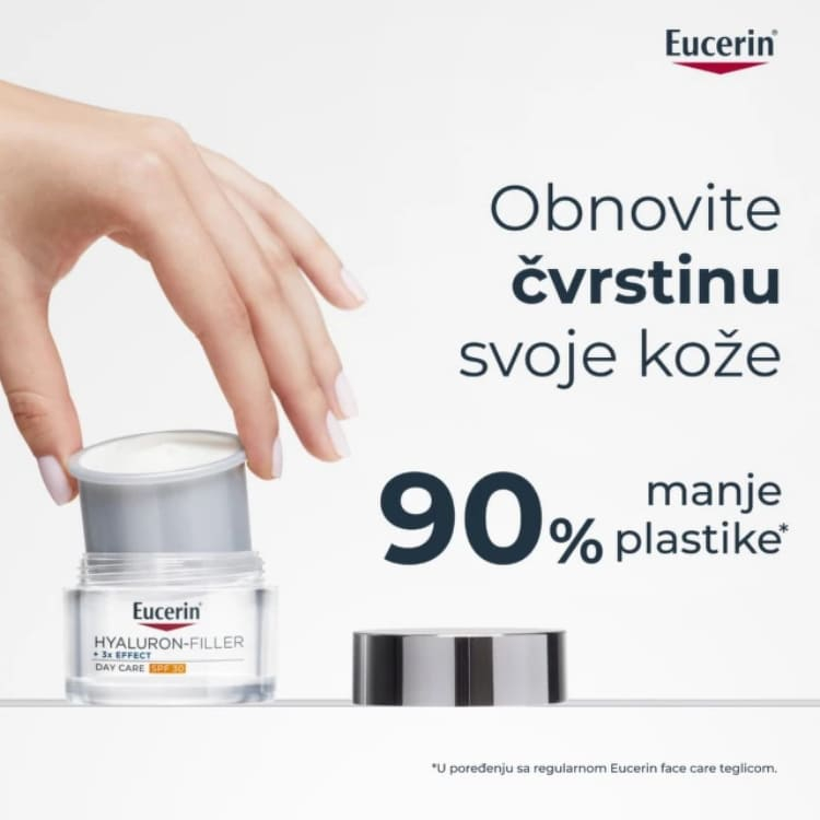 Održiva ambalaža: Teglica sadrži 90% manje plastike u odnosu na standardne Eucerin Hyaluron-Filler kreme, čime doprinosi održivijem životnom ciklusu proizvoda.
