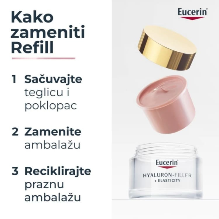 Održiva ambalaža: Krema dolazi u ambalaži koja sadrži 90% manje plastike nego standardne Eucerin Hyaluron-Filler kreme, što doprinosi smanjenju ekološkog otiska.