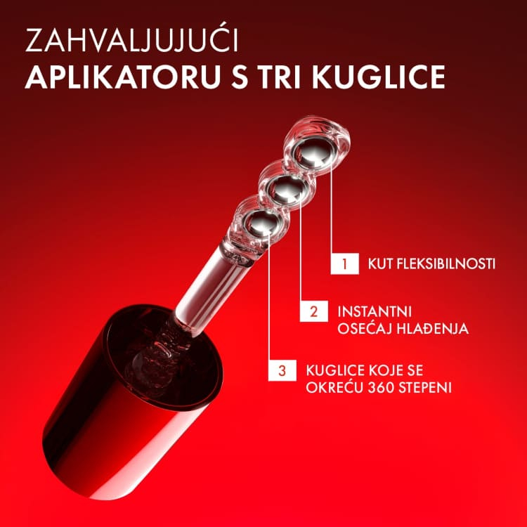 Pakovanje je opremljeno aplikatorom sa tri metalne kuglice koje omogućavaju ravnomerno nanošenje i blagu masažu. Ovakav način aplikacije doprinosi osećaju hlađenja, podstiče mikrocirkulaciju i poboljšava apsorpciju formule.