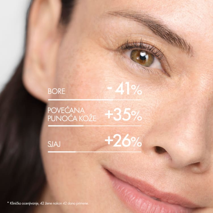 Smanjuje bore i štiti od pojave tamnih fleka. Povećava elekastičnost. Pomaže ublažavanje štetnih uticaja menopauze i UV zračenja. Koža deluje čvršća, a bore i tamne fleke su svakim danom sve manje vidljive.