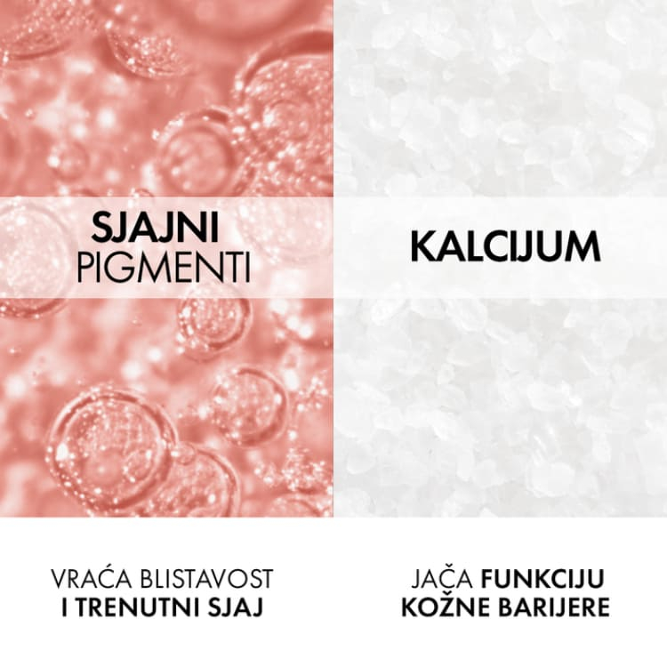 Ova ružičasta dnevna krema kombinuje snagu kalcijuma, pčelinjeg voska i ružičastih sjajnih pigmenata u hranljivoj, osvežavajućoj formuli koja trenutno obnavlja prirodni sjaj kože. Koža izgleda osnaženo, svežije i čvršće, dok dugotrajnom upotrebom postepeno poboljšava tonus, vitalnost i zdrav ružičasti sjaj.