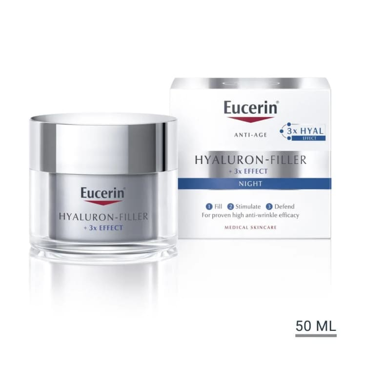 Eucerin Hyaluron-Filler Noćna krema sadrži dva različita tipa hijaluronske kiseline za ciljanje i tretiranje svih vrsta bora i bioaktivni saponin za aktivno povećanje proizvodnje hijaluronske kiseline same kože. Koncentrovani dekspantenol podržava proces regeneracije kože tokom noći. Koža je meka i zbrinuta.