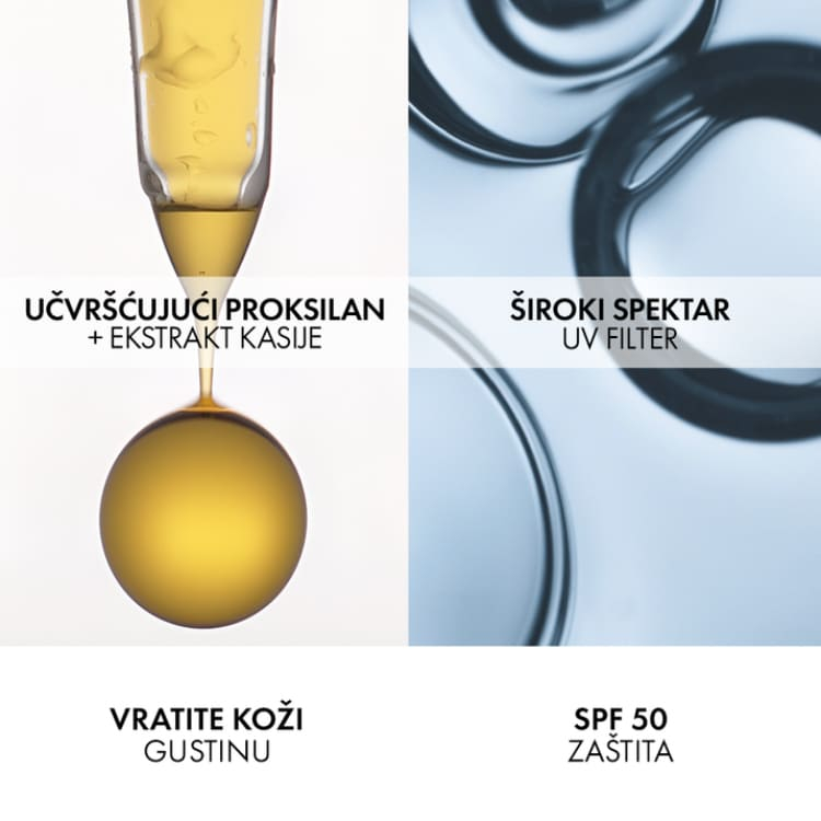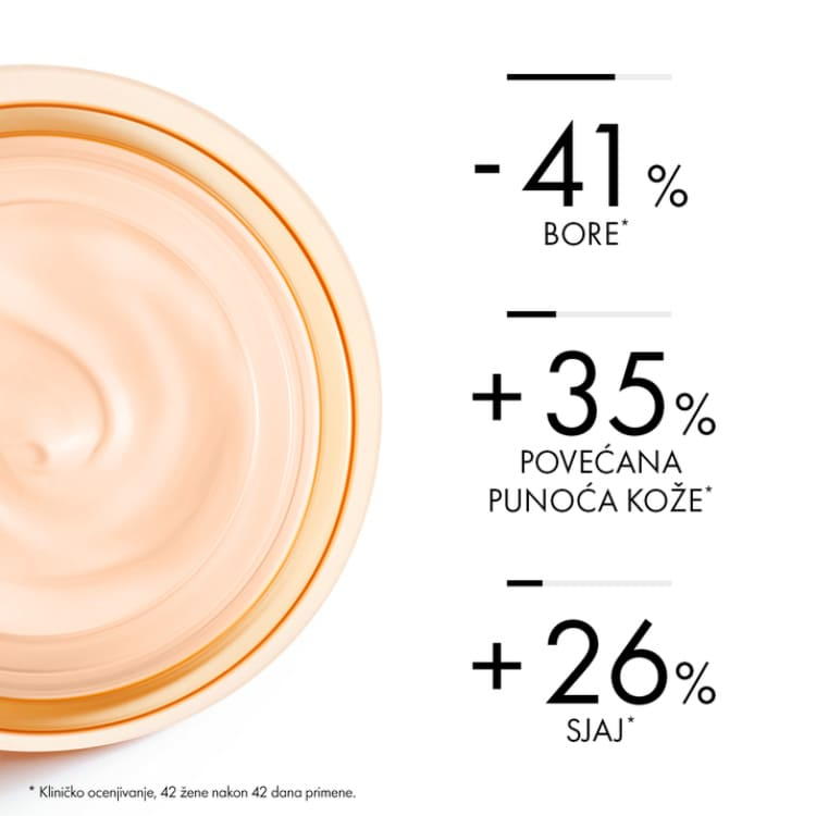 Smanjuje bore i štiti od pojave tamnih fleka. Povećava elekastičnost. Pomaže ublažavanje štetnih uticaja menopauze i UV zračenja. Koža deluje čvršća, a bore i tamne fleke su svakim danom sve manje vidljive.